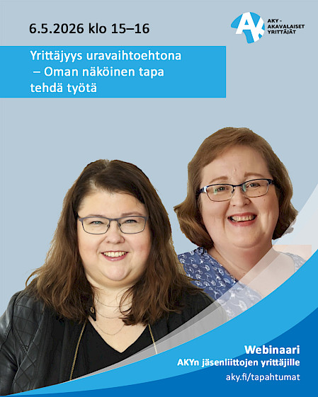 Webinaarissa puretaan yrittäjyyden myyttejä, tarkastellaan monimuotoisia tapoja toimia yrittäjänä ja pysähdytään sen äärelle, millainen yrittäjyys sopii juuri sinulle.